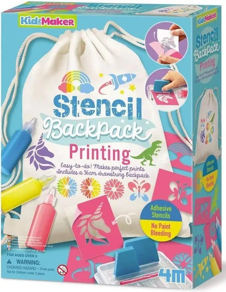 Embark on a colourful journey of creativity and self-expression with the 4M KidzMaker Stencil Backpack Printing Kit! Allowing kids to craft their very own personalised drawstring backpack with ease.