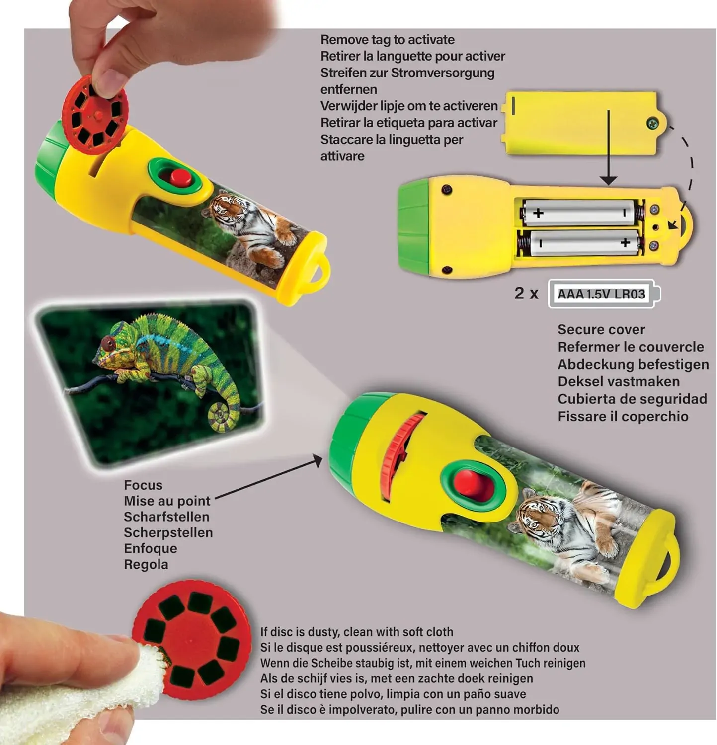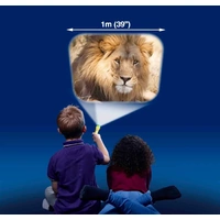 The torch is supplied with three slide discs which include 24 colour Animal photographs. Swap and change the slides easily by inserting the chosen disc, then rotate the disc round to view the fantastic colour images which project up to one metre wide. Images are easily focused by turning the lens head. This product can be used as a normal torch without the slides in place and is great for keeping on bedside tables to give comfort to children during the night. The torch measures 12cm long.