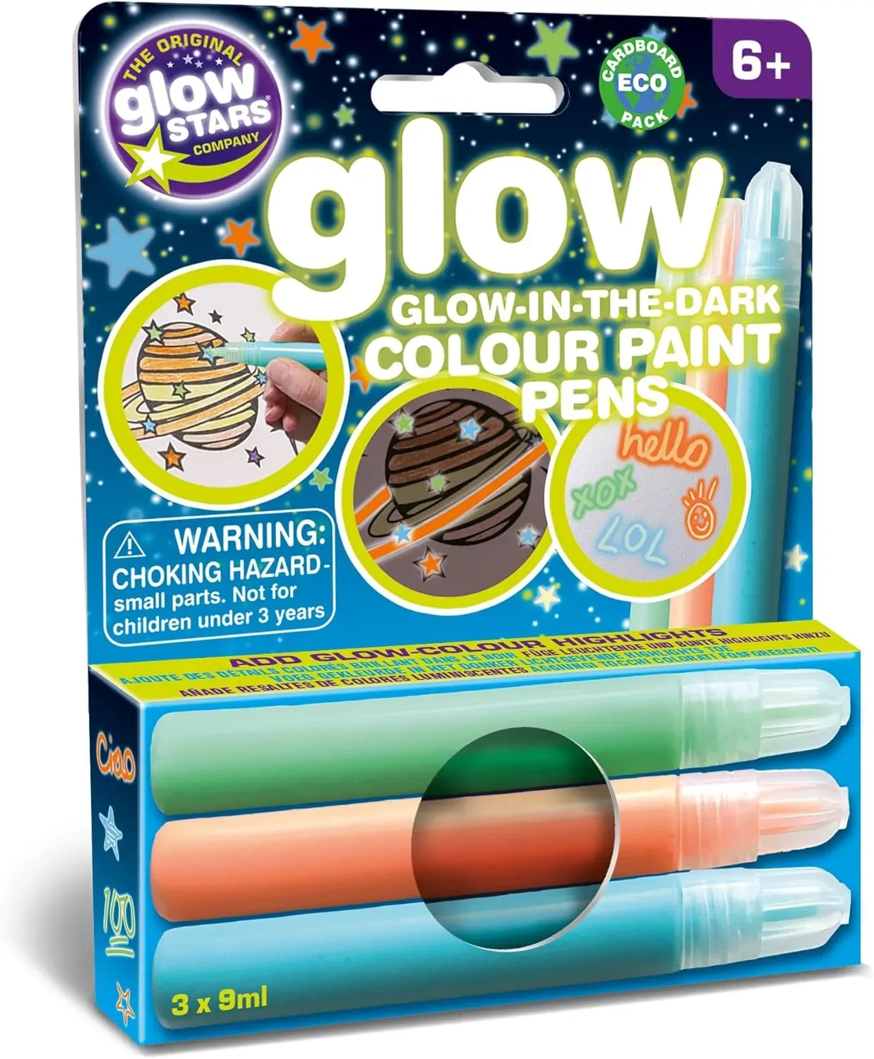 Glow-in-the-dark colour paint pens can be used to add glow-in-the-dark highlights to art and craft projects. Create your own glow-in-the-dark features on drawings, stickers, posters and books with these easy to use glow-in-the-dark paint pens by The Original Glowstars Company. Adds that special touch to party and Halloween decorations!