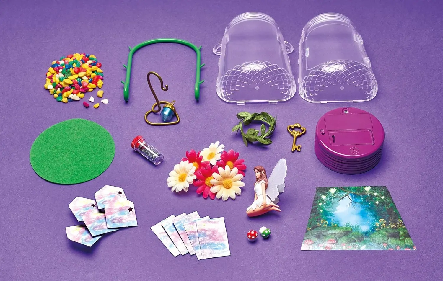 Place the enchanted forest background in your Jar with coloured stones and grass-green felt. Decorate with pretty flowers and leaf garland. Add the toadstools, acorn with love-heart stand and your adorable fairy, for a magical fairyland scene. Finally sprinkle with eco-fairy dust and make a magic wish!