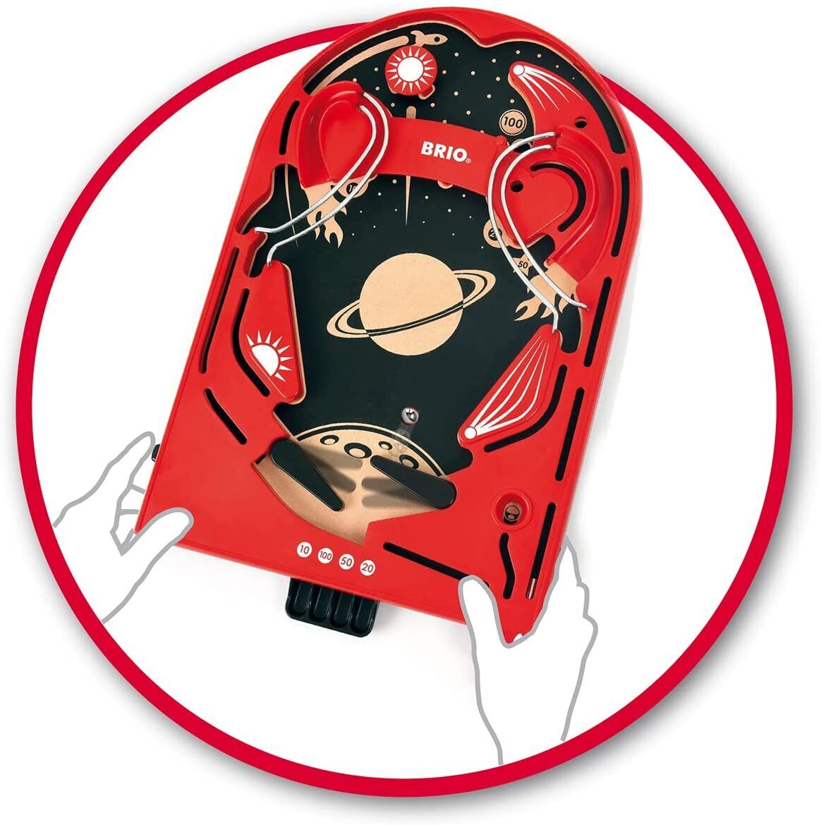 How many points can you rack up? Take on the challenge with the BRIO Pinball Game - an exciting toy pinball machine with a mix of beautiful design and fun features. Load the metal ball into the launch ramp and then fire it off with the wooden plunger. Youll need to be quick on the flippers to catch the falling metal ball as it flies and bounces around the space themed playfield. Get the ball down one of the points holes and it will reappear at the bottom scoring section to display your score. Play with all 5 balls and then tally up your high score.