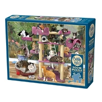 Cats and kittens are having a blast on their towering cat towersome peacefully snoozing, others playfully hanging around. Peek behind a lush wall of plants to spot a few more mischievous felines adding to the fun! A 500 piece cat puzzle by Robert Giordano.