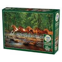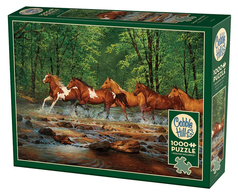 The horses are off on their Spring Creek Run, ready to gallop through the forest to reach lush fields on the other side! This 1000 piece puzzle by artist Chris Cummings captures the spirit of wild beauty and freedom, showcasing majestic horses in a breathtaking natural landscape. Perfect for wildlife and nature lovers, each piece brings you closer to the thrill of the open fields and the heart of freedom!
