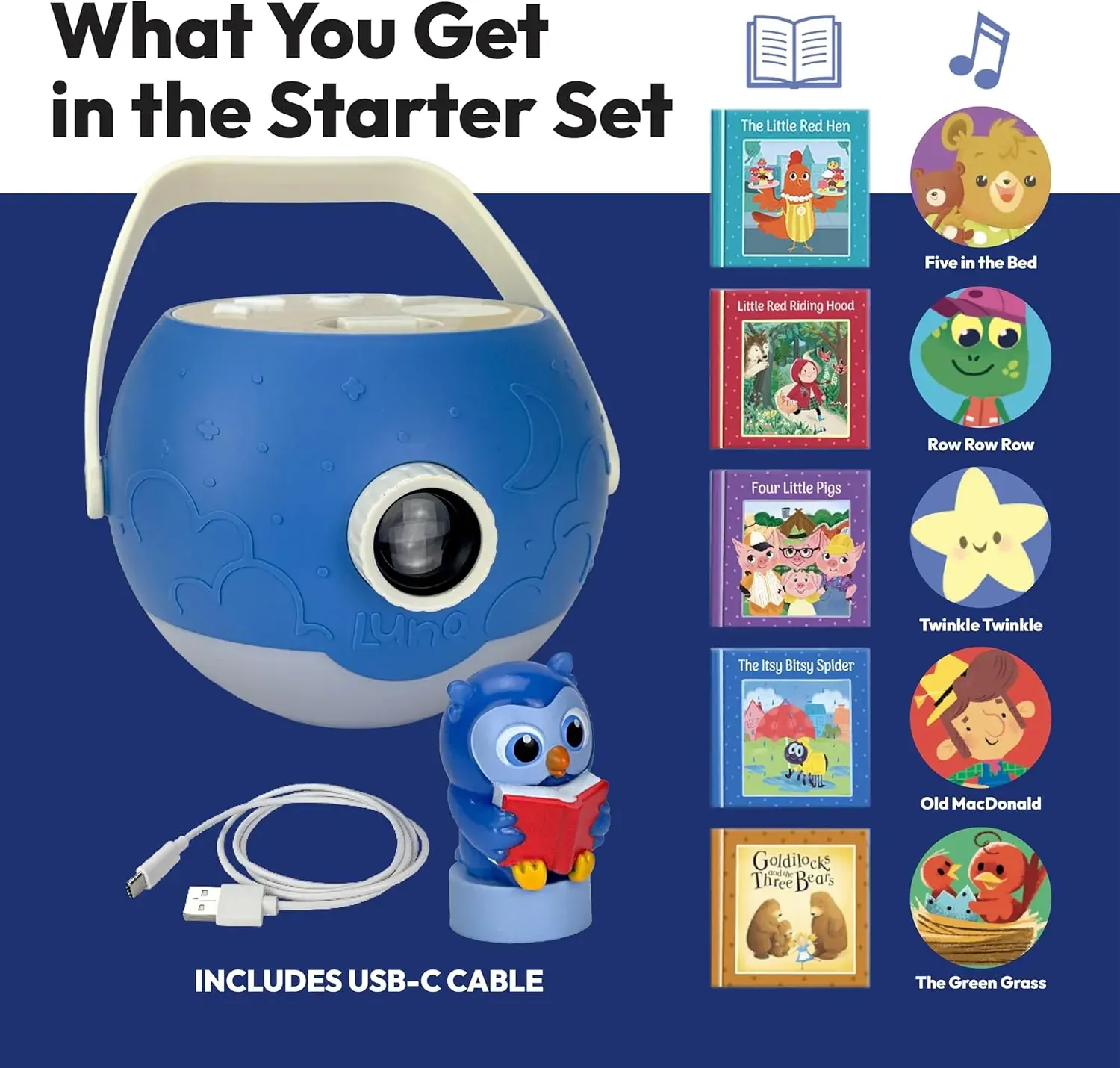 Featuring classic childrens books like, Little Red Riding Hood, Goldilocks, and The Itsy Bitsy Spider, Luna creates an immersive, hands-free reading experience with 750+ bright, high-quality projected images to 2.4 metres! Boosts early literacy and imagination, watch listen and read along.