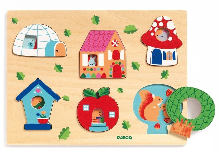 A bright and colourful home themed wooden puzzle to delight toddlers. It features 6 different types of homes; an igloo, house, toadstool, birdhouse, apple and treehouse. Underneath each of the home-shaped pieces is a character illustration. By lifting up a piece, children discover who is living in that home.