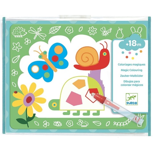 A water-based colouring set specially designed for little ones aged 18 months and over. Children use the water-filled pen to colour in the white areas and discover what is hiding. It's magic as the patterns appear! Once the pages are dry, the fun starts all over again! Plastic boards to colour again and again. Handy storage set that is easily portable.