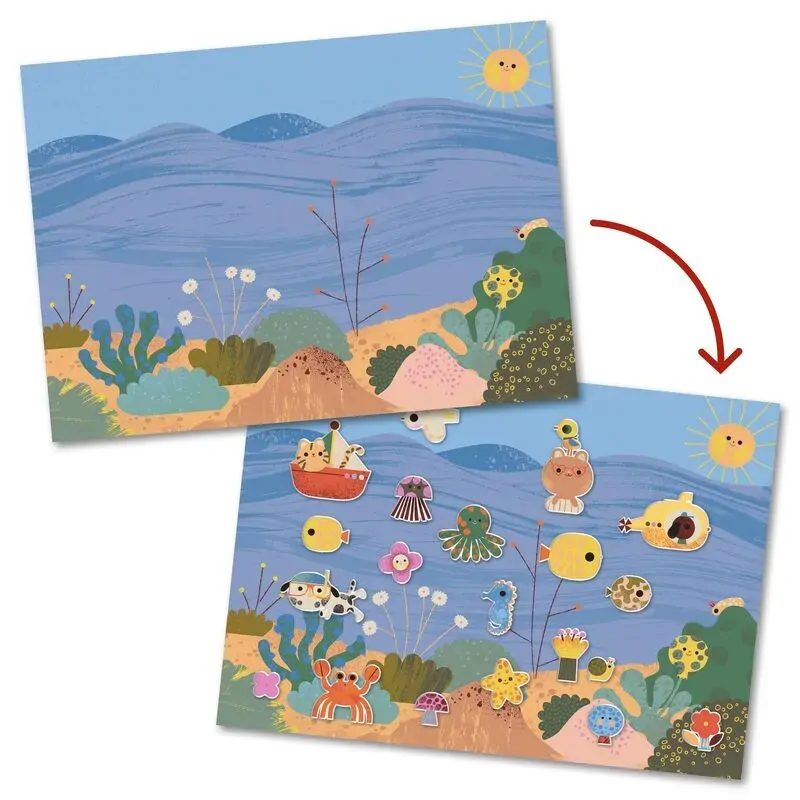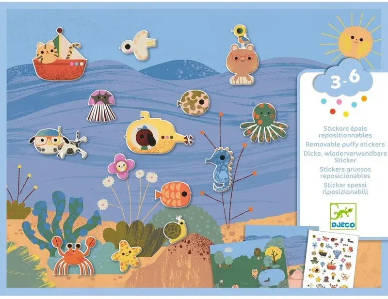 Let your child's imagination shine with the Summertime 30 pc Reusable Puffy Stickers set! This big arts and crafts folder allows children to create holiday scenes at the seaside or in the countryside. Featuring two large illustrated backgrounds, kids can create fun and adventurous scenes using more than 30 reusable puffy stickers. The set includes amazing backgrounds to explore and complete, stimulating children's imaginations. The thick puffy stickers are pleasant to use and specially designed for little hands, allowing children to move them around to create different scenes every time. This activity combines creativity and free play, letting children dream up stories while having fun.