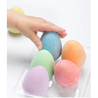 It's easy to forget how much fun it is to draw on your footpath or driveway! First Creations Easi-Grip egg chalk was designed especially to fit in the palm of a child's hand. This non-toxic washable chalk allows young children to have more control over their drawing. Use on a variety of surfaces such as blackboards, outside pavement, concrete surfaces. Chalk is easily removed by washing down with water. This set includes half a dozen eggs in pink, green, orange, blue, purple and yellow in a sturdy container for easy storage.