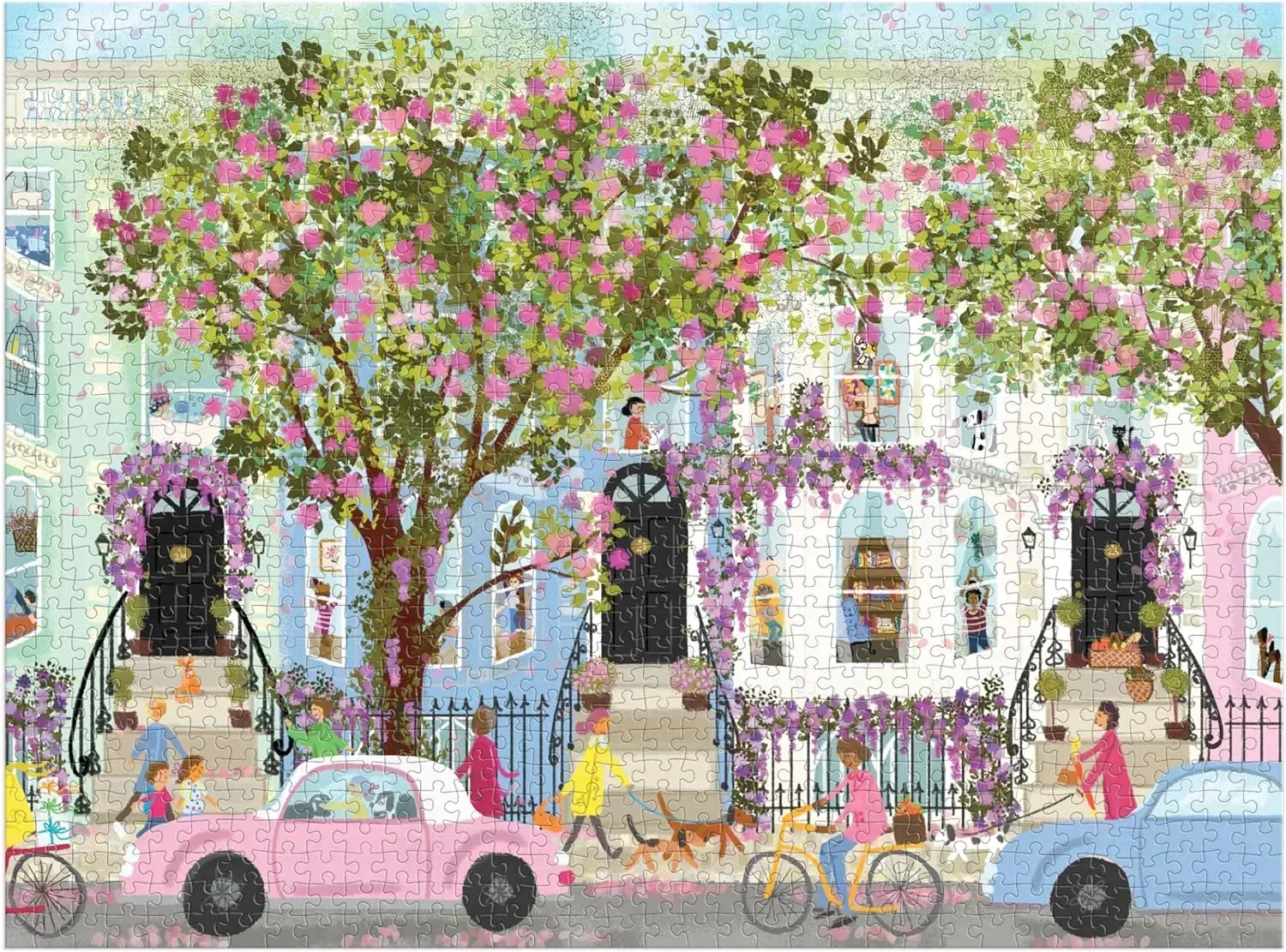 Bestselling artist Joy Laforme expertly applies her unique sense of colour, texture, and whimsy to a magnolia-filled residential block on the Spring Terrace 1000 Piece Puzzle.