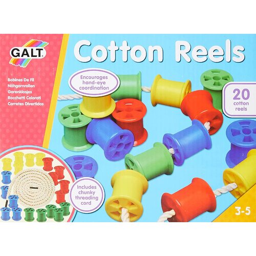 Set of 20 cotton rells in 4 bright colours plus a chunky threading cord. Ideal for threading and stacking to encourage hand/eye coordination and manual dexterity. Made from tough, durable plastic.