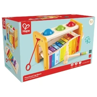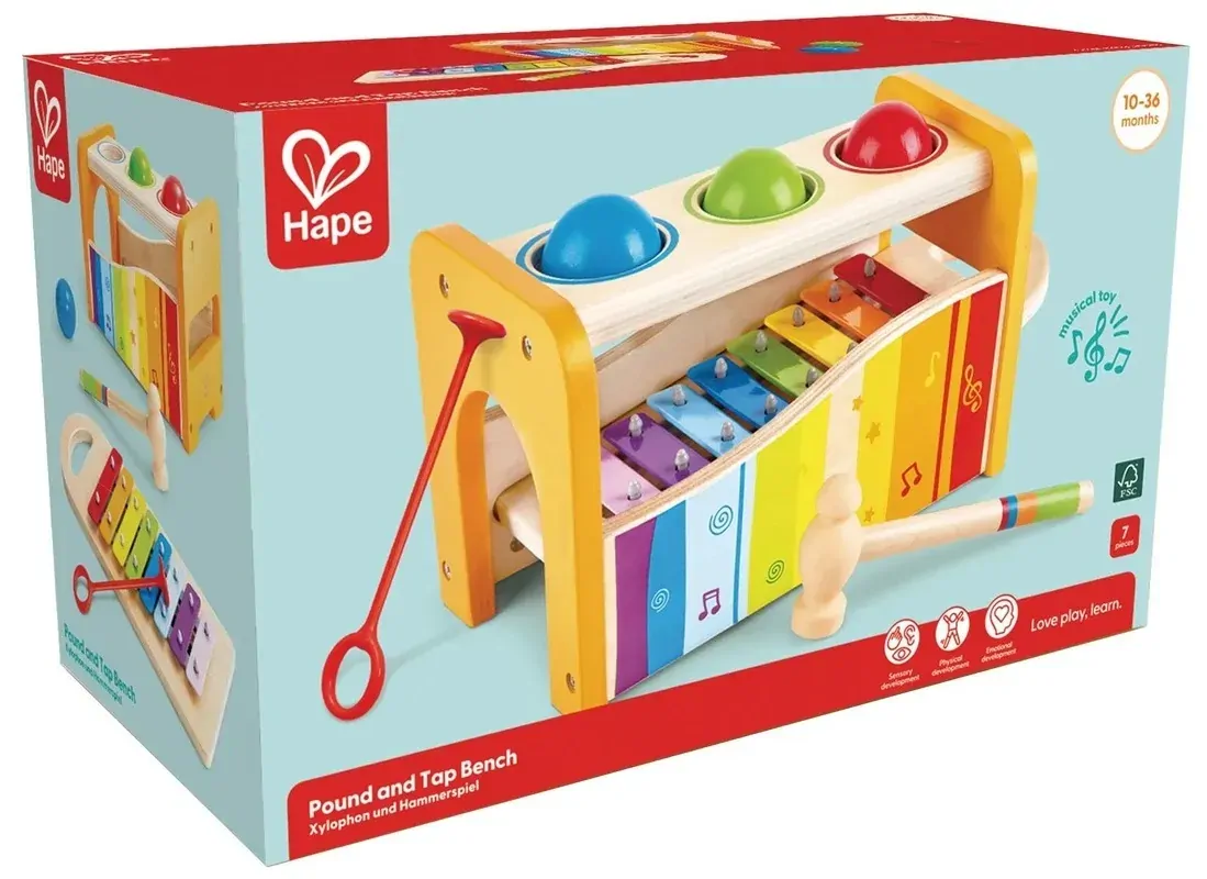 This combination of xylophone and hammer bench has easy grip handles, wooden balls and hammer. Xylophone can be pulled out and played separately.