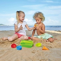 This beach play set includes: three plastic cones, three cups, an ice cream scoop, and a bucket.