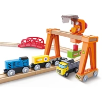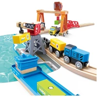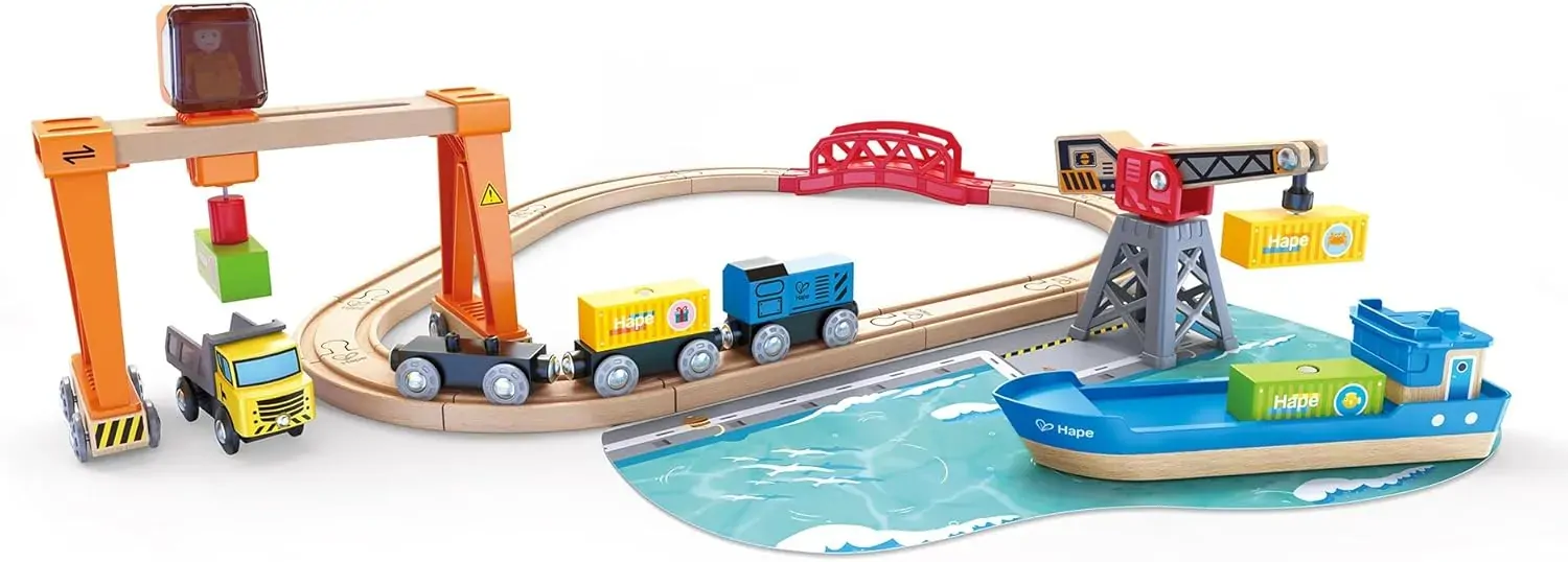 - PLENTY OF PIECES: It is a great harbour set for children to learn about sea and rail transportation. Includes a gantry crane, a loading crane, six small curved rails, two large curved rails, one six-inch straight rail, one four-inch straight rail, one eight-inch straight rail, one cargo ship, one locomotive, two trailers, one truck, four cargo blocks, one figurine, one bridge and one ocean cardboard.