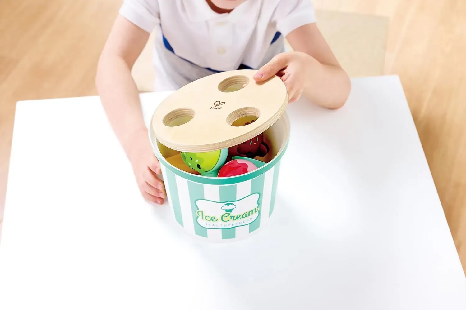 The Hape Scoop & Serve Ice Cream Set brings interactive play to life with a realistic ice cream bucket, functional scoop, and rotating display for endless flavour and topping combinations. Featuring three colourful ice cream balls, three jam types, and five dessert toppings, this wooden toy encourages imaginative play while enhancing motor skills, social interaction, and language development. Perfect for role play and kids kitchen setups, children can create and showcase their sweet masterpieces just like a real ice cream shop. A delightful play food set for toddlers and young chefs, ideal for family fun and creative learning.