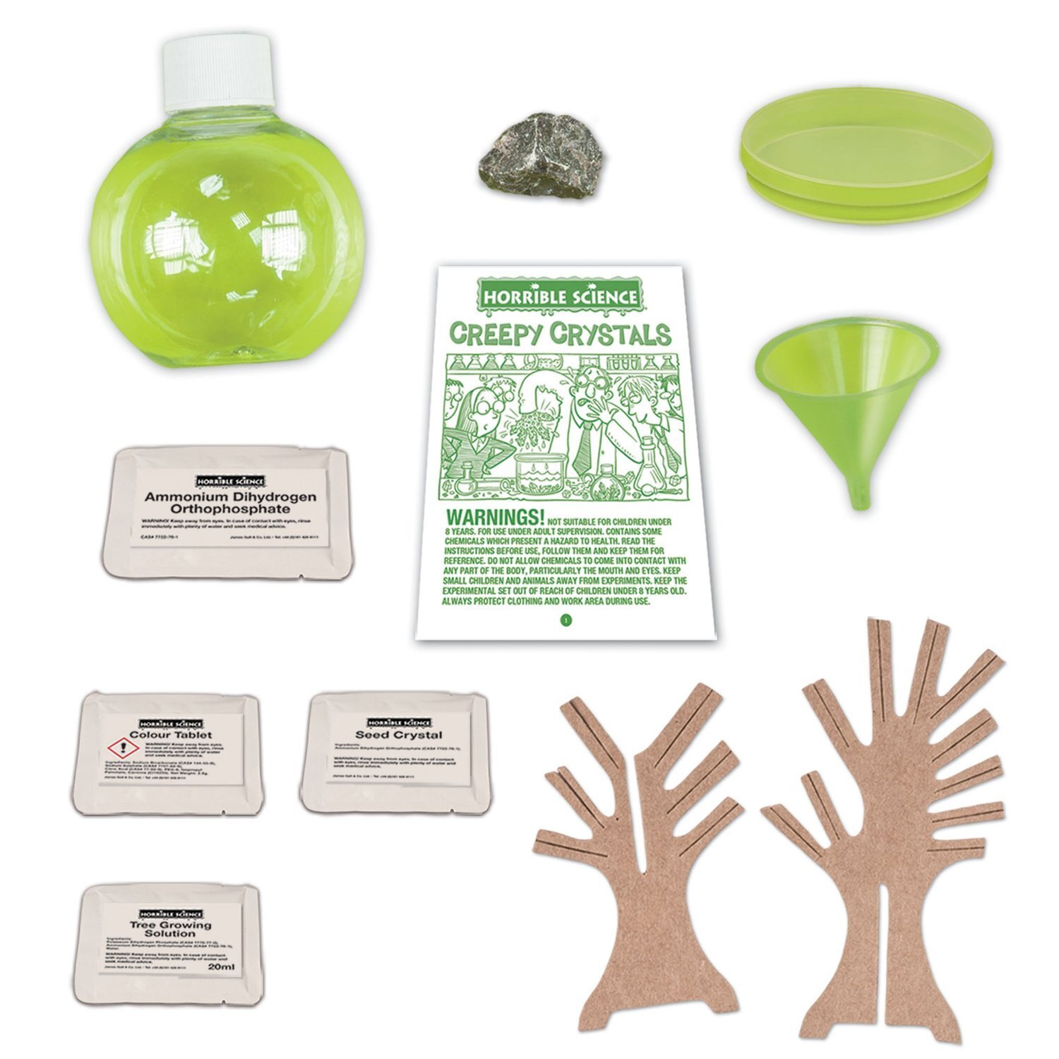 Contents: ammonium dihydrogen orthophosphate, tree growing solution, tree card, Petri-dish, colour tablet, seed crystal, round bottle, funnel, limestone rock and 'Horrible Info' leaflet.