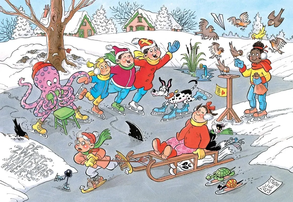 How happy the Jan van Haasteren friends are to be able to skate on natural ice! A great experience and everyone seems to be doing well. Rebecca makes sure the little birds don't lack anything. Jan van Haasteren Junior introduces children to the absurd world of these famous puzzles. They take their first steps into the humorous illustrations of Jan van Haasteren and make progress with different piece counts and difficulty levels.