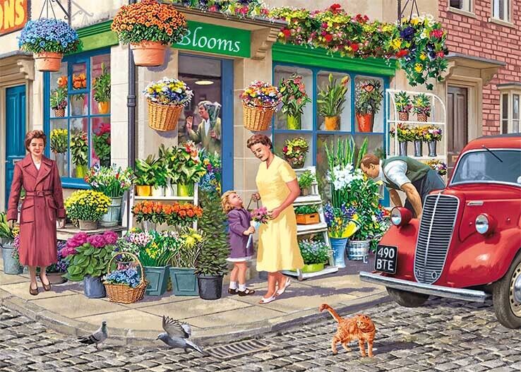 The Florist is the title of this beautifully illustrated 1000-piece Falcon de luxe jigsaw puzzle, which is part of the Nostaliga collection. The delightful image depicts a local florist filled to the brim with an array of colourful blooms, giving a wonderful snapshot of life in a bygone era of cobbled streets and classic motor cars.