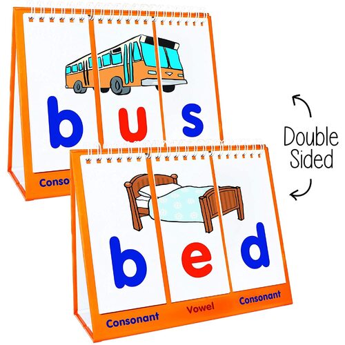 CVC Flips is an early flip stand for teaching the spellings of consonant-vowel-consonant words. Images form when correct spellings are made that relate to the word. Double-sided with different examples on each side.