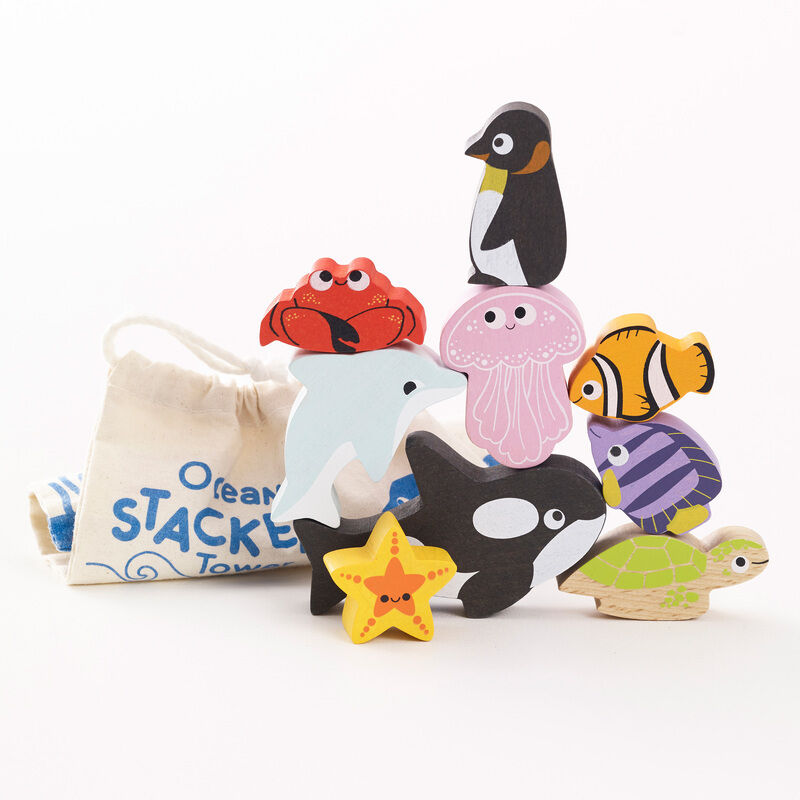 Are you ready for an adventure under the sea? This adorable ocean stacker set contains 9 aquatic animals that can be balanced into towers or used in imaginative open-ended play. The animals are made from sustainable FSC wood and decorated in safe water-based, chip-resistant paints. The set comes packaged in a cotton bag making it great for on-the-go play. The animals featured include;