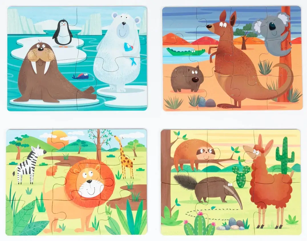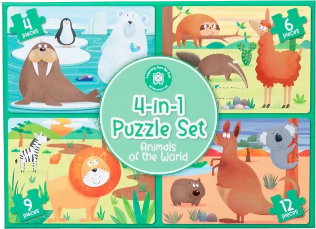 Embark on a global wildlife journey with the Learning Can Be Fun 4-in-1 Puzzle Set! Each puzzle, ranging from 4 to 12 pieces, features adorable animals from different parts of the world. Tailored to suit different stages of child development, these puzzles foster skills like spatial awareness and problem-solving. Crafted with durable materials and bespoke illustrations, this set offers endless learning through play!