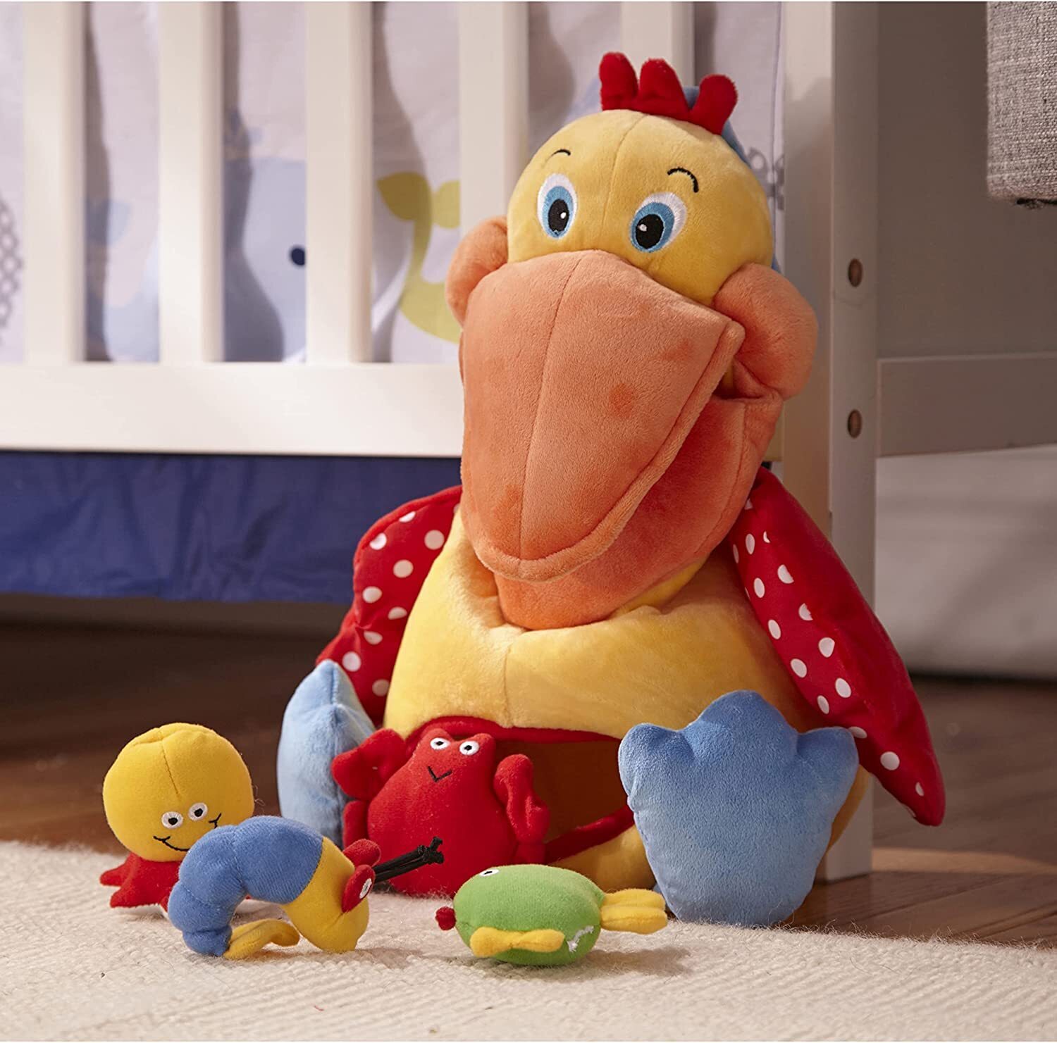 This cuddly plush pelican has an empty belly . . . and a big appetite for fun! Young children can open the pelican's big bill (which squeaks when squeezed!) to drop four mini plush animals into his open mouth. Then the crinkly shrimp, squeaking octopus, and rattling fish and crab drop right into the bird's big belly! A peek-in, reach-in window on the pelican's front lets kids spot them easily and pull them out to try it all again. The repetitive activity is great for babies and toddlers working on motor skills and other early developmental skills. And thanks to an incredible array of fun-to-explore features--from chubby, squeak-able cheeks to crinkly wings to floppy, rattling feet--it never gets old!
