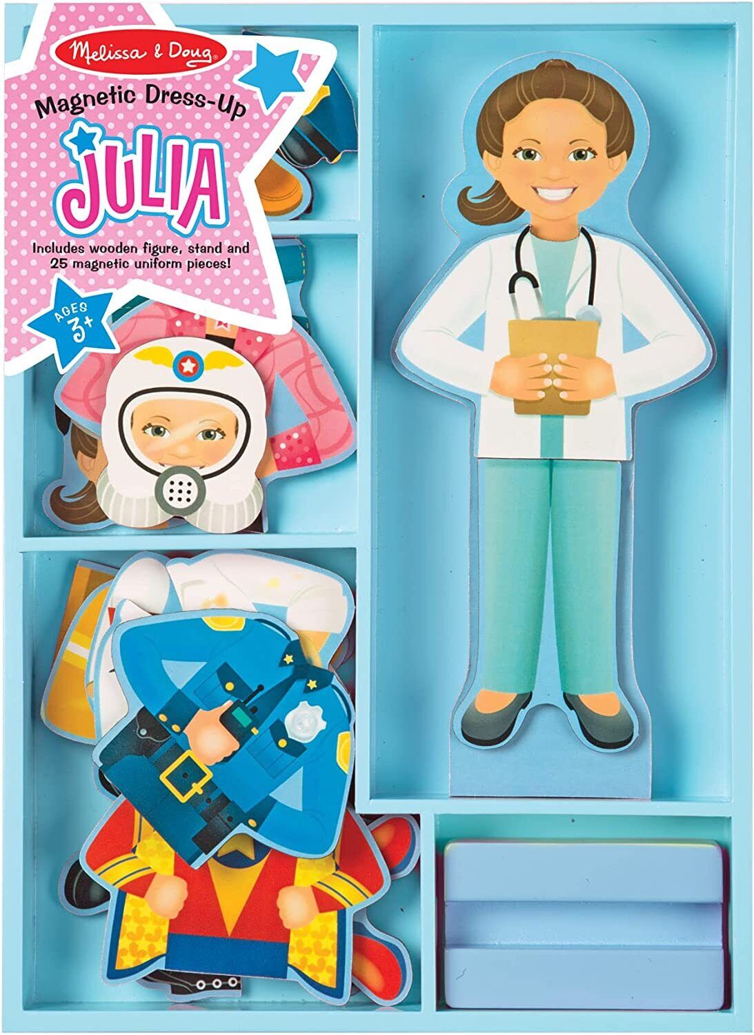 Whatever job Julia decides to take on, she can be dressed for success! Whether it's an astronaut, firefighter, doctor, superhero, artist, rock star, chef, or police officer, she is ready to tackle many tasks at a moment's notice. The set includes a magnetic wooden dress-up figure with a wooden stand and 24 magnetic clothing pieces to create eight occupational uniforms and outfits. The doll, stand, and pieces all store in a sturdy wooden tray. This unique dress-up doll helps kids three and older develop hand-eye coordination and fine motor, counting, and sorting skills, and encourages creative expression and imaginative play.