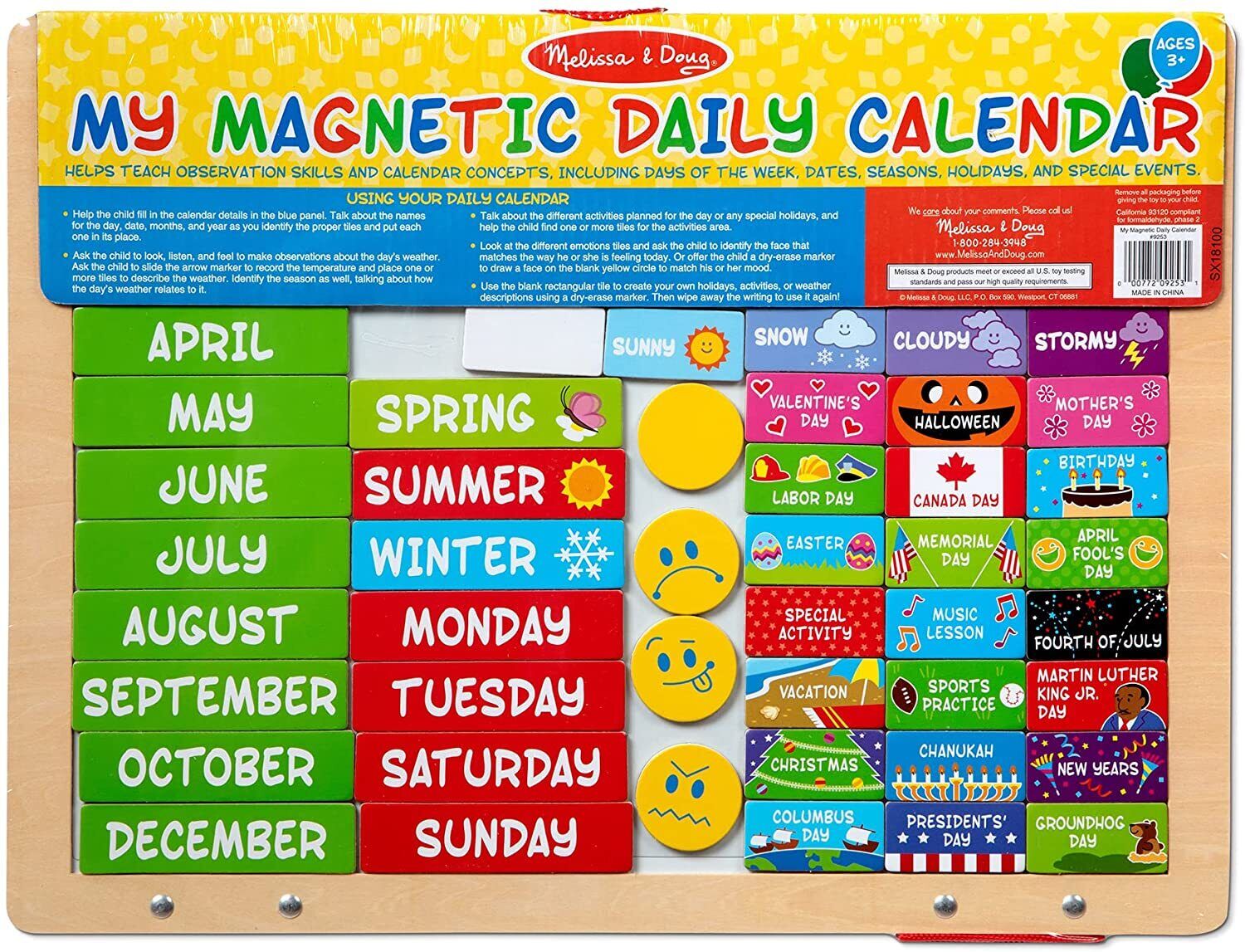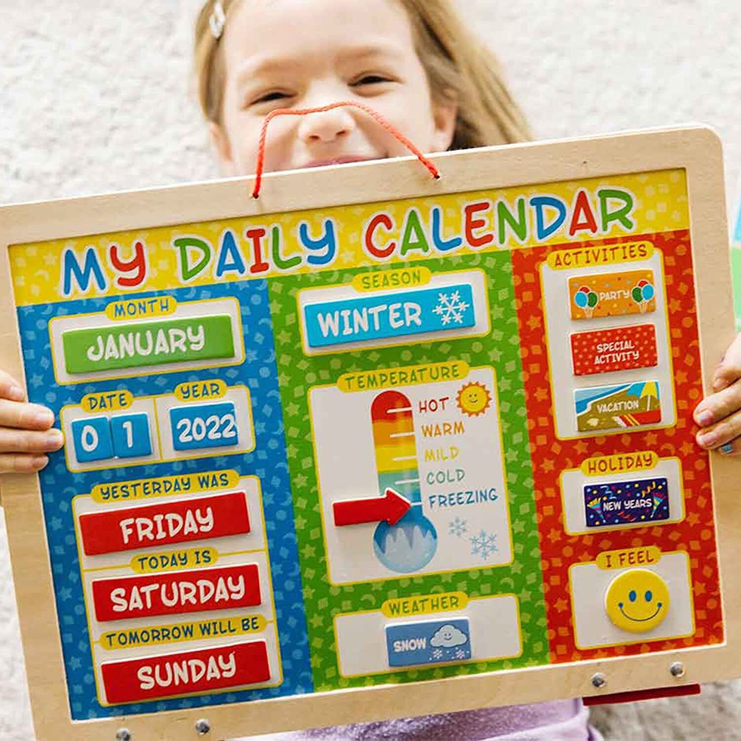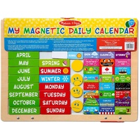 What is today? For a child, that simple question can have so many answers--and this daily calendar helps satisfy them all! Kids will feel a greater sense of control and responsibility when they help post the day of the week, date, weather, and special events on the large magnetic board for all to see. There's even a space to post their mood--an excellent way to open communication and encourage children to gauge their own emotions. Updating the information is simple: Simply take a preprinted magnet from the lower magnetic board (which hangs below the calendar to keep magnets within easy reach). Then place it on the calendar to fill in the information . . . or make a custom magnet by writing on one of two dry-erase magnet tiles! There are fields for day, date, season, weather, temperature, activities, holiday, and mood.