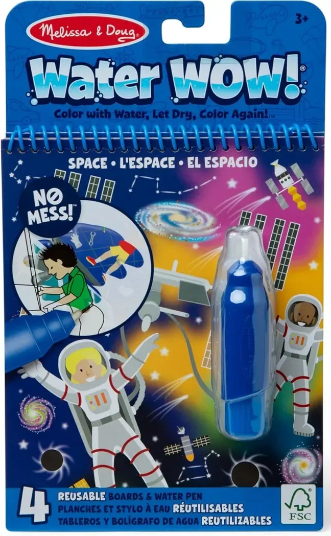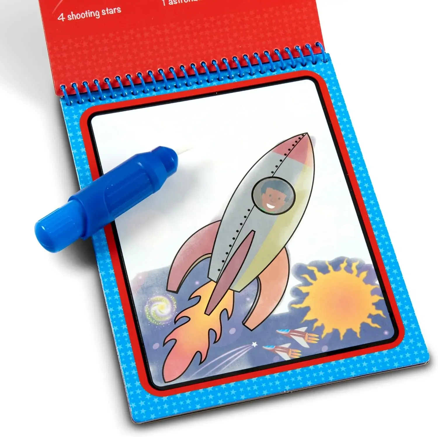 No-mess painting for kids! This exciting paint-with-water colouring book includes four reusable pages and a refillable water pen. Simply use the pen to colour in each scene--details and vibrant colour appear with every stroke! Then let the page dry to erase the pictures and colour it in again and again. This space-themed book includes four exciting scenes to colour (satellites, rocket ship, lunar landing, and space station), and a search-and-find activity for each scene. The chunky-sized water pen is easy for kids to hold and stores neatly right in the front cover, making this Water WOW! an ideal travel activity book and travel toy for kids!