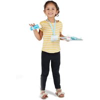 The set includes realistic instruments like a pick, mirror, and floss, a dental rinse bottle and cup, 2 gauze pads, 3 tooth polish cups, and an instrument tray to keep organized. A mask, reusable ID tag on a lanyard, and a double-sided reusable activity card round out the dentists office experience.