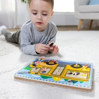 The wheels on the bus go 'round and 'roun... and kids will play with this puzzle over and over! Lift the six pieces of the school bus to reveal different pictures underneath that show what's happening, and to hear the different verses of the classic children's song. Sing along as the wipers go, "swish, swish, swish," the horn goes, "beep, beep, beep," and more! The lyrics are on the back of the sturdy wooden resting board to help kids learn the words.