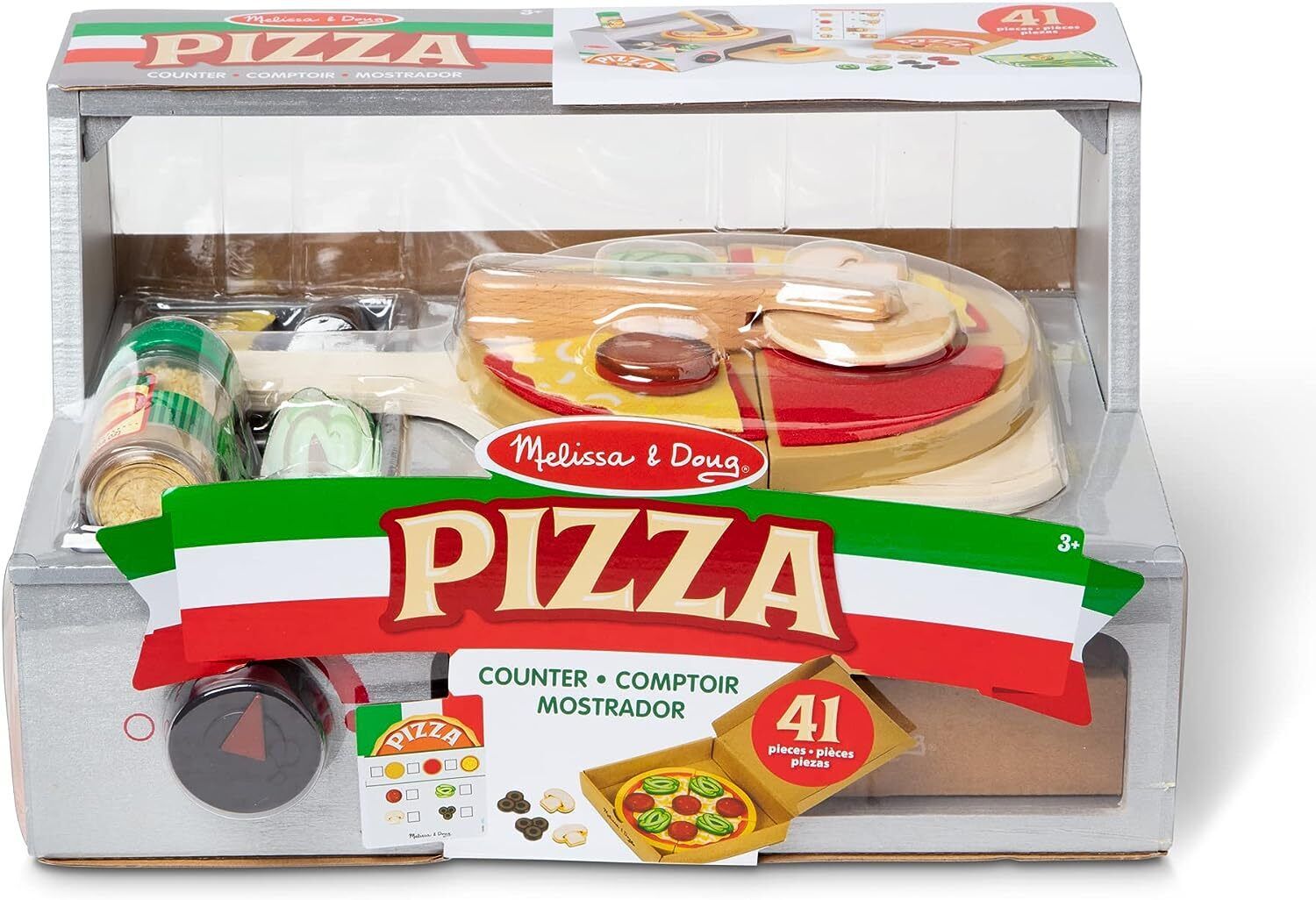 - Also includes wooden pizza counter, pizza paddle, rolling cutter, delivery box, prep instructions and reusable menu, play money