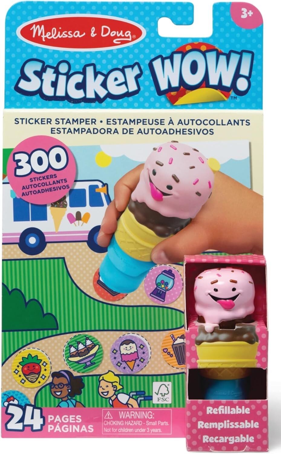 Melissa & Doug Sticker WOW! is a whole new way to play with stickers! Let the adorable, collectible Frosty the Ice Cream stamp, stamp, stamp its way through 24 pages of fun-filled, sweets-themed counting, matching, and search-and-find activities. The refillable sticker stamper comes pre-loaded with a sticker stack of 300 assorted stickers with 100 unique designs in every stack, each sticker is a surprise!