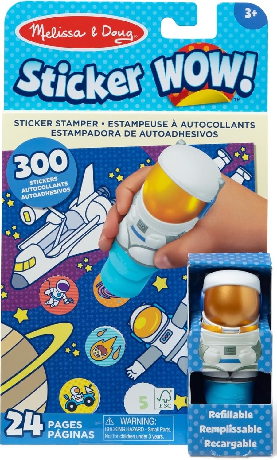 Melissa & Doug Sticker WOW! is a whole new way to play with stickers! Let the adorable, collectible Atlas the Astronaut stamp, stamp, stamp its way through 24 pages of fun-filled, space-themed counting, matching, and search-and-find activities. The refillable sticker stamper comes pre-loaded with a sticker stack of 300 assorted stickers with 100 unique designs in every stack, each sticker is a surprise!