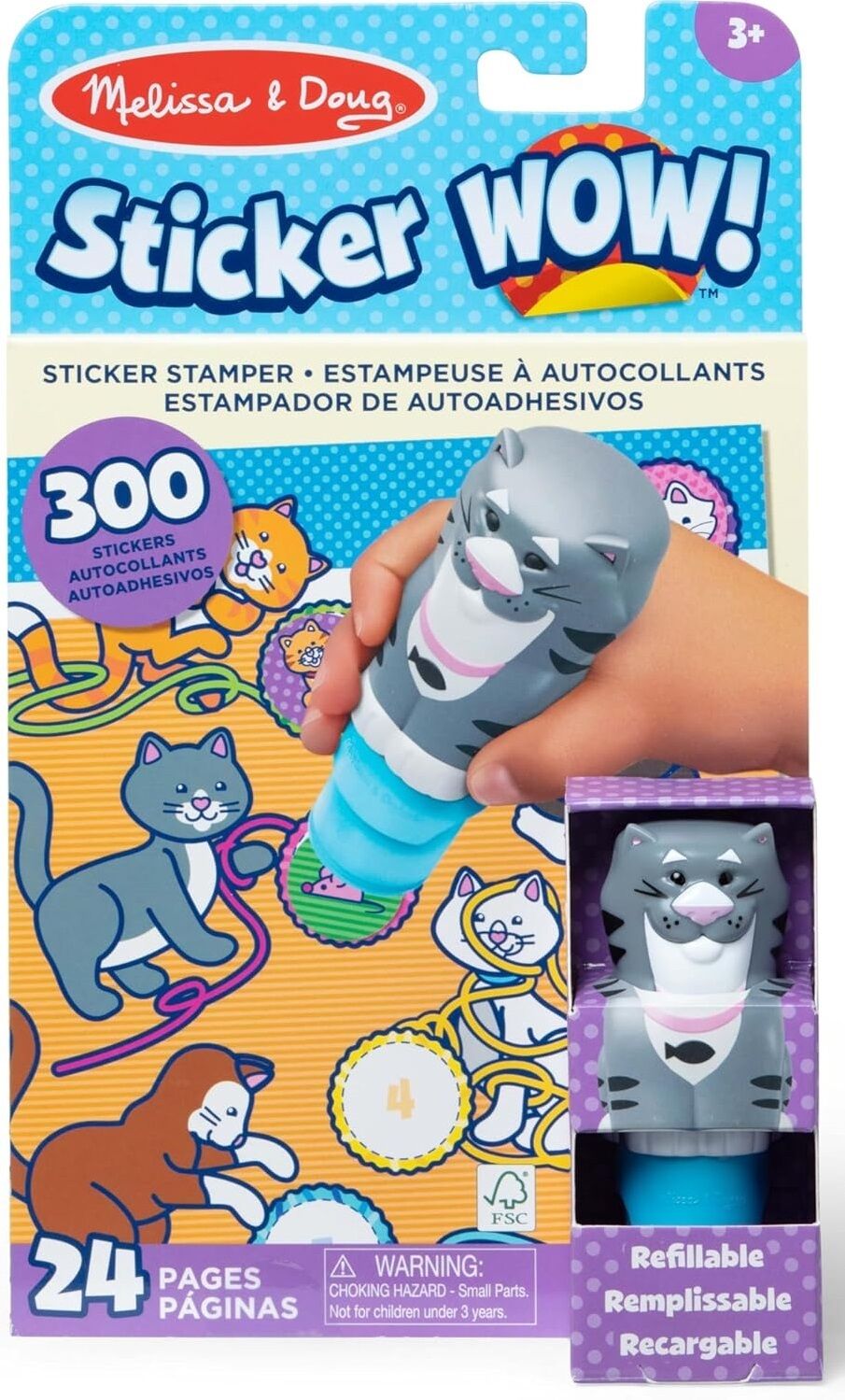 Melissa & Doug Sticker WOW! is a whole new way to play with stickers! Let the adorable, collectible Tuna the Cat stamp, stamp, stamp its way through 24 pages of fun-filled, pets-themed counting, matching, and search-and-find activities. The refillable sticker stamper comes pre-loaded with a sticker stack of 300 assorted stickers with 100 unique designs in every stack, each sticker is a surprise!