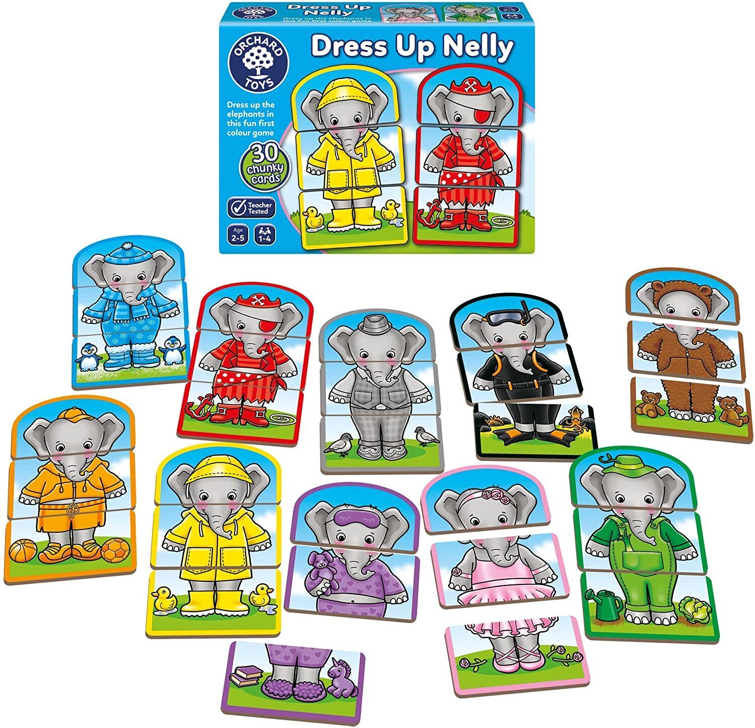 Use the friendly elephants to learn about colours as you dress them in their different outfits! Dress Up Nelly can be played as a fun and simple activity to introduce children to colours, by placing all the cards face up and matching or mis-matching their head, body and legs.
