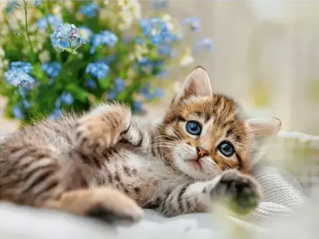 Relax with this adorable kitten lounging by delicate blue flowers.