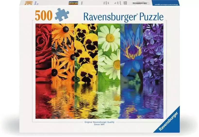Assemble 500 high-quality pieces to reveal a spectrum of floral images dissolving into a water textured reflection. Roses, Rudbeckia, pansies, Shasta daisies, blue lotus and lilacs mirror their vibrant colours in shimmering water.