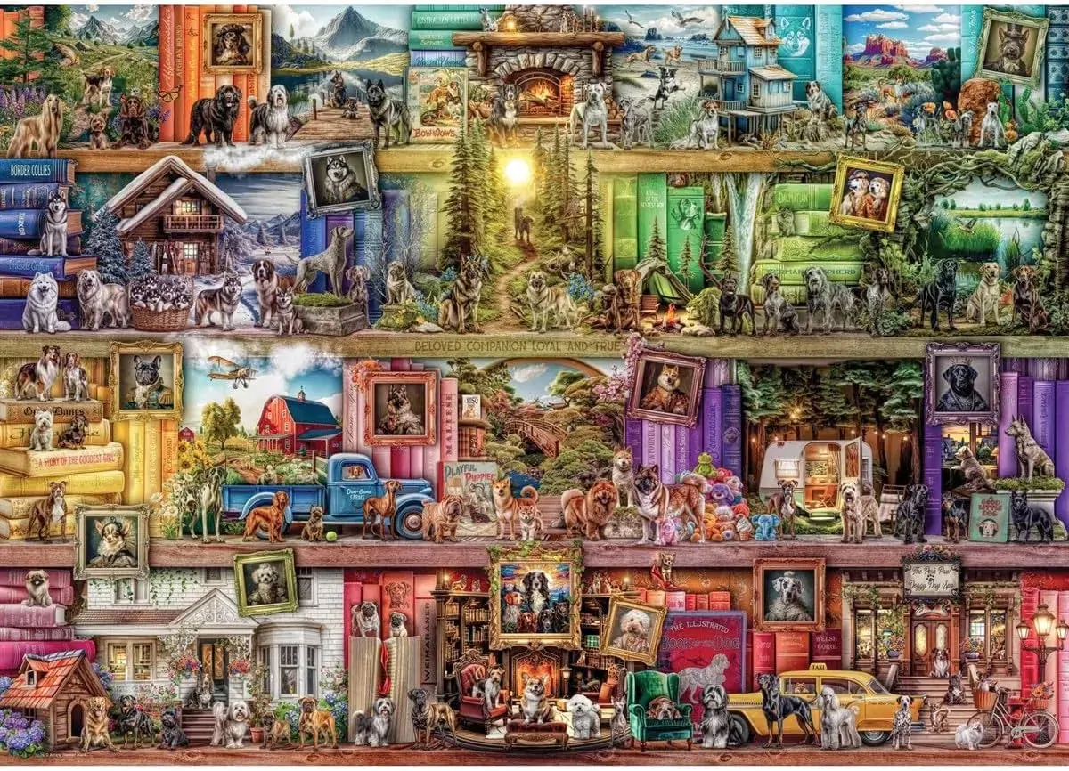 Embark on an intriguing and intellectual adventure with a 1000-piece jigsaw puzzle showcasing the enigmatic "Library of Dogs." The atmosphere within exudes a serene ambiance, inviting puzzle enthusiasts to explore the intricate details of this unique and imaginative world. The puzzle pieces interlock to reveal a scene that ignites the imagination, showcasing a harmonious blend of knowledge, curiosity, and the endearing charm of these scholarly canines.