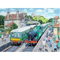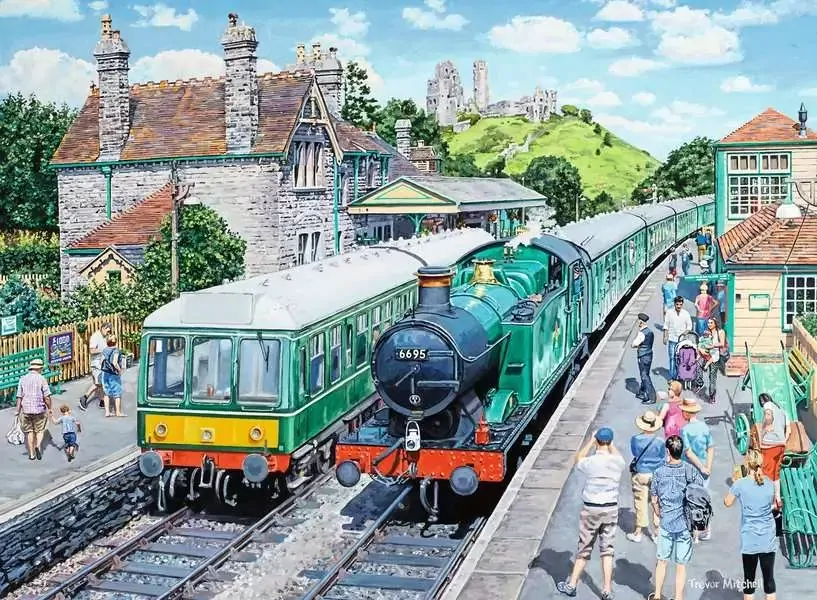 Corfe Castle Station. The vintage trains and charming Victorian buildings at Corfe Station depicted on this puzzle form a stunning foreground to the 1000-year old castle stronghold beyond. Corfe is just one of the beautiful stops waiting to be discovered along the course of the Swanage Railway. Discover more online at www.swanagerailway.co.uk