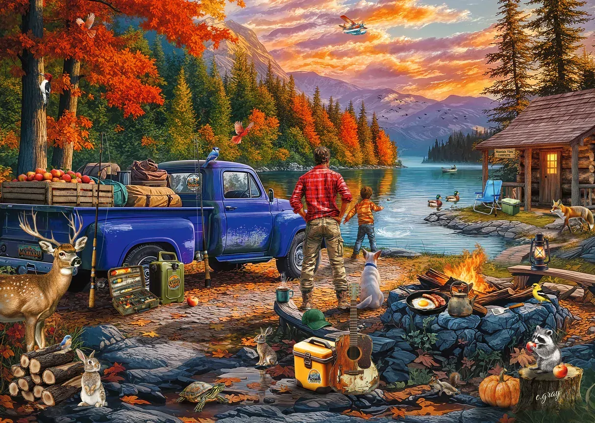Relax and unwind with the Ravensburger Sunset Lake 300-piece Large Format jigsaw puzzle. Designed with larger pieces for easy handling, this puzzle is perfect for a peaceful evening of stress-free puzzling. The beautiful scene features a father and son camping by a quiet lake, surrounded by vibrant autumn colours glowing under a stunning purple and orange sunset. Watch as the boy skips rocks across the water, a seaplane glides overhead, and woodland creatures, including a buck, rabbits, and a cheeky raccoon quietly look on. With Ravensburgers premium quality and precision-cut pieces, this puzzle is a joy to assemble and an ideal choice for anyone who loves relaxing, nature-themed puzzles.