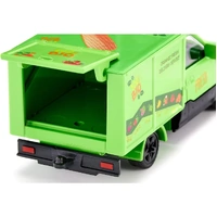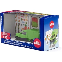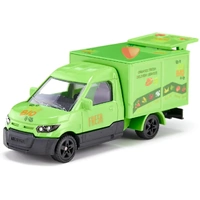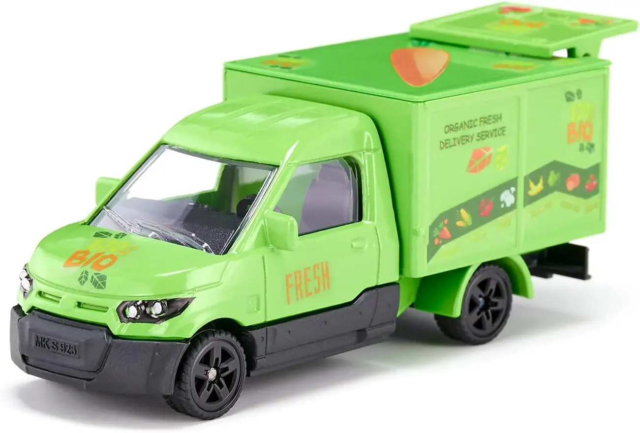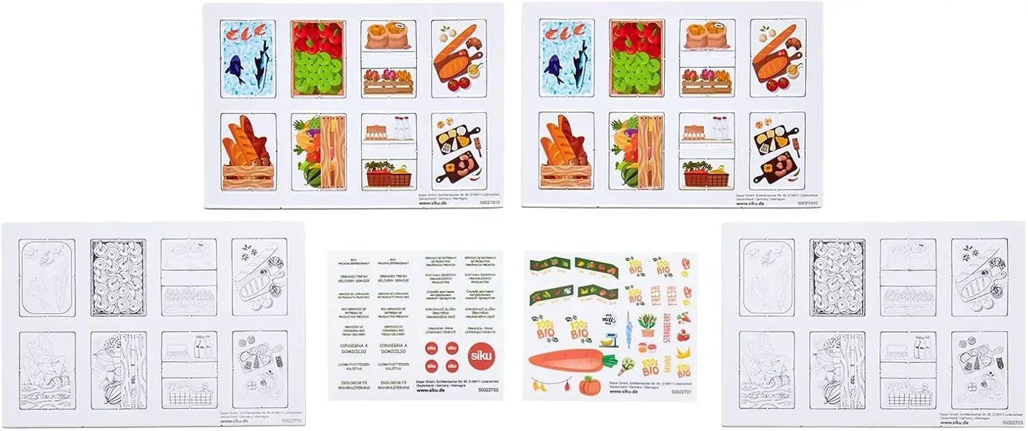 The drivers cab of this Siku model is made of metal, and the superstructure is plastic. A flap at the rear can be opened for loading and unloading. With the sheet of stickers provided, the transporter can additionally be decorated with the lettering Fresh organic deliveries in various languages, and also with colourful images of fruit and vegetables. And because a delivery service requires suitable produce, there are also four cardboard sheets from which preprinted foodstuffs such as fruit, vegetables, eggs, and milk can be pressed out. However, on only two of the four sheets are the components printed in full colour. Only the outlines are printed on the other two sheets, and so the children themselves become creative and can colour the foodstuffs in whatever way they wish.