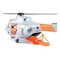 The rumble of the rotors announces the arrival of the large rescue helicopter. The SAR helicopter is deployed under the most difficult conditions at sea and in the mountains. With cable winches and stretchers, the helpers are able to rescue accident victims and to attend to them medically in the helicopter. The helicopters are also deployed in crisis areas for the transport and lowering of heavy goods. For this, the side doors and the rear flap of the SIKU helicopter can be opened. The rear flap is so large that a SIKU vehicle can drive in and out. Like the original, the SIKU transport helicopter is painted grey, and only the two large side doors are fluorescent orange. The helicopters rotor can be turned and the undercarriage can be extended. The cable winch is raised automatically during rescue manoeuvres.