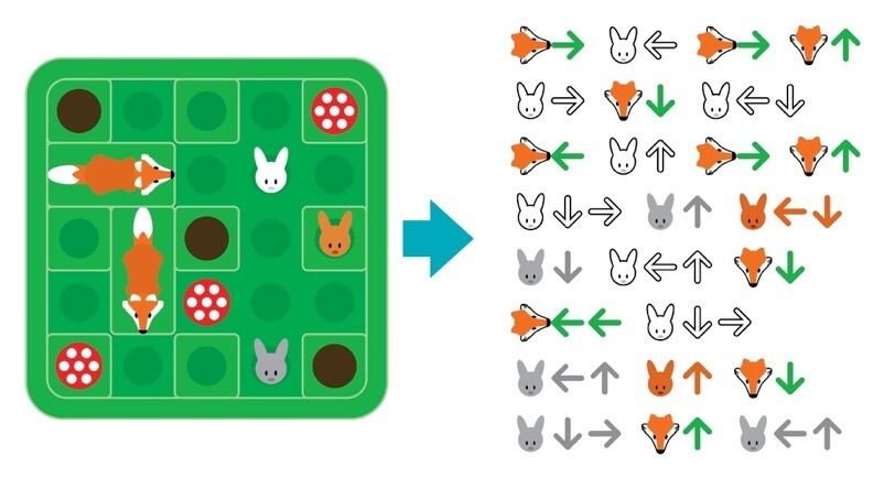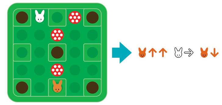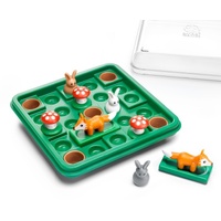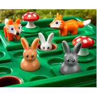 Use other rabbits, mushrooms and even the moving foxes to jump around and hide the rabbits in their holes.