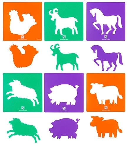 These durable, thick , plastic stencils are easily cleaned. Measuring 203mm x 203mm. Set of 6 includes Pig, Horse, Chicken, Cow, Sheep and Goat.