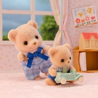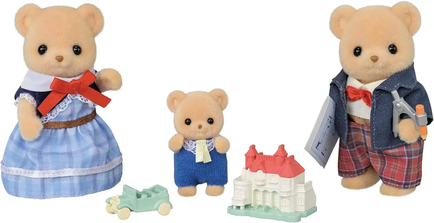 Meet the Biscuit Bear Family. The set contains father Lloyd, mother Elena, baby Noa, design tools, and a toy car.