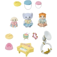 The set includes Maple Cat Baby, Elephant Baby, Flora Rabbit Baby, a sousaphone, star piano, drum, moon tambourine, baby seat, stand.