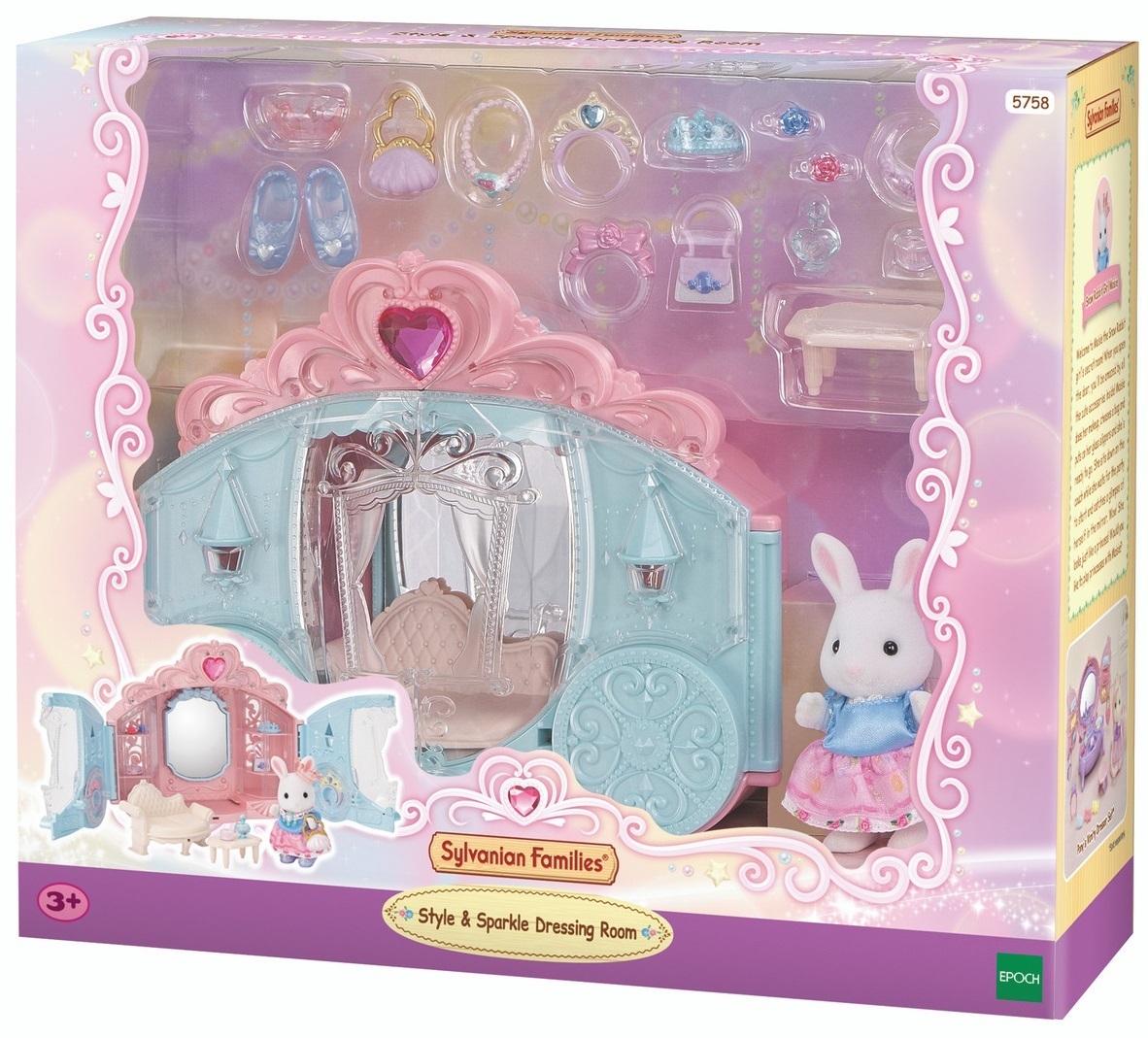 The Style & Sparkle Dressing Room comes with a beautiful, sparkly carriage, accessories and the Snow Rabbit girl dressed like a princess. The double doors of the carriage open to transform into a stylish room with lots of beautiful accessories and shelves to put them on. Comes with lots of accessories so you can enjoy creating various looks. The carriage has a handle so you can use it as a carry case for the figure and accessories.