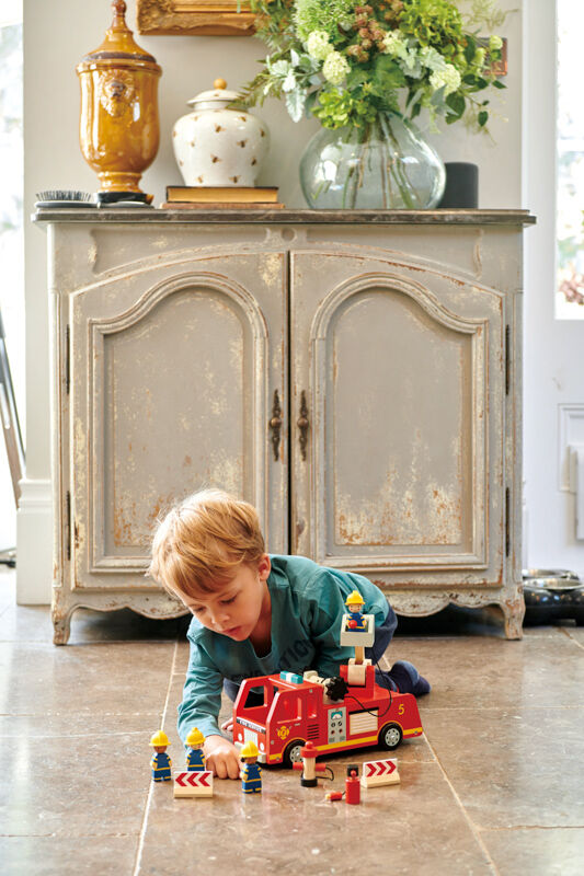 This bright red wooden fire truck features an unrolling hose and a natural wood extending arm to take the 4 provided fire fighters up to dizzying heights to fight fires. Lift the back panel to access a hydrant, extinguisher, 4 barricades, a cone, and an extra length of hose.