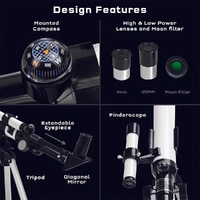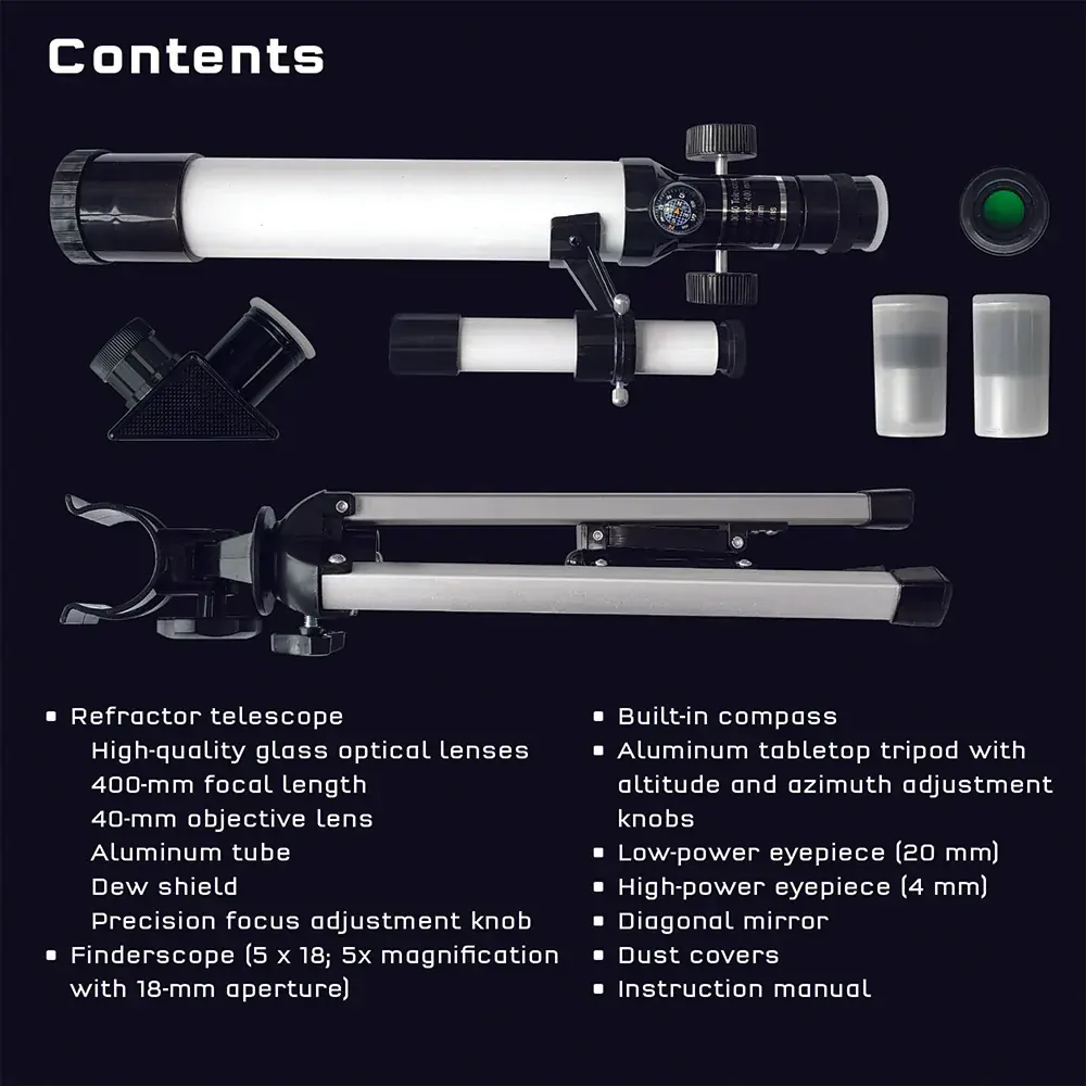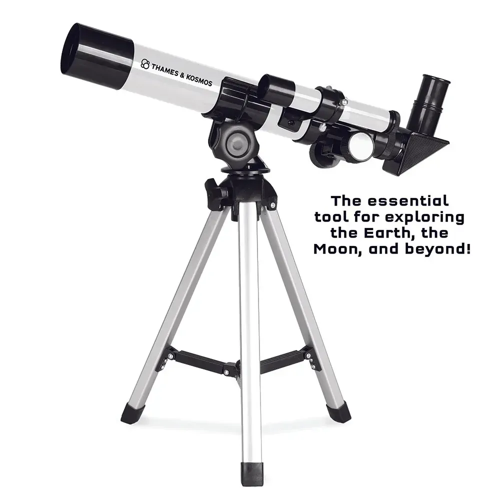 Set your sights on the Moon and beyond! With this excellent entry-level telescope, Thames & Kosmos continues a long tradition of inspiring people to reach for the stars. This high-quality refractor telescope with glass optics allows for countless exciting space observations. With it, you can see the Moon and its craters in good detail; Mars, Saturn, Jupiter, and more! Terrestrial observations on Earth are also possible. The included instruction manual guides you through setting up and using the telescope.