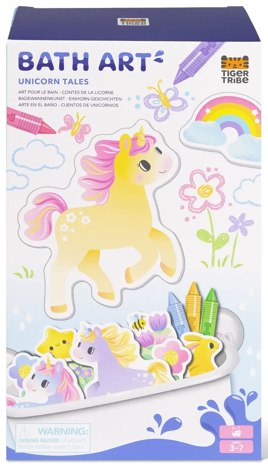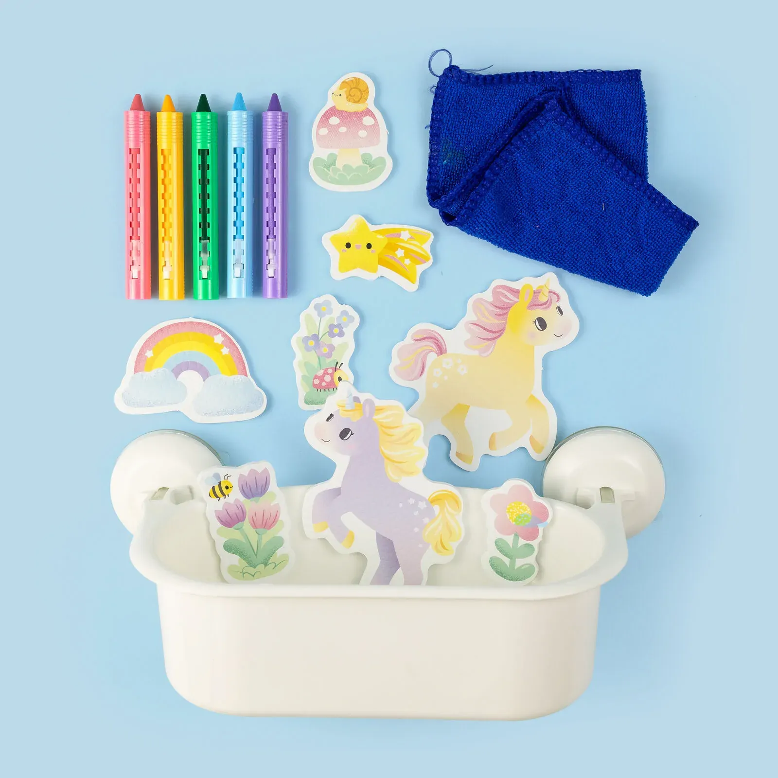 - Unicorn themed Bath Art set with bath crayons and foam stickers